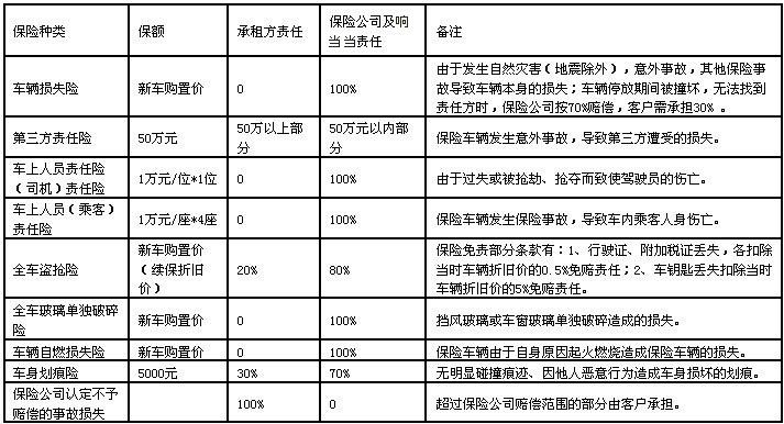 客戶在租用車輛期間,將享受租用車輛的已購保險及業(yè)鳴租車與保險公司已生效的其他相關保險權益 保險說明: |